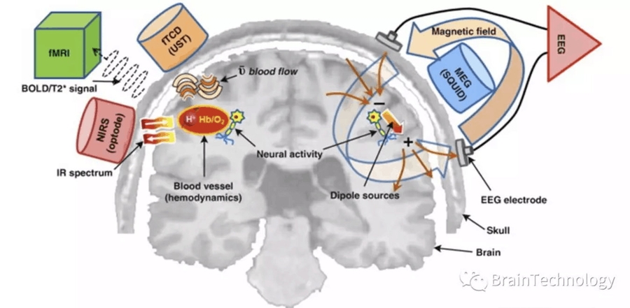 对大脑研究的技术手段来说,离不开目前的一些设备——脑电(EEG/ERP)、脑磁(MEG)、近红外脑成像(NIRS)、核磁共振成像(MRI)、功能性核磁共振成像(fMRI)等设备。