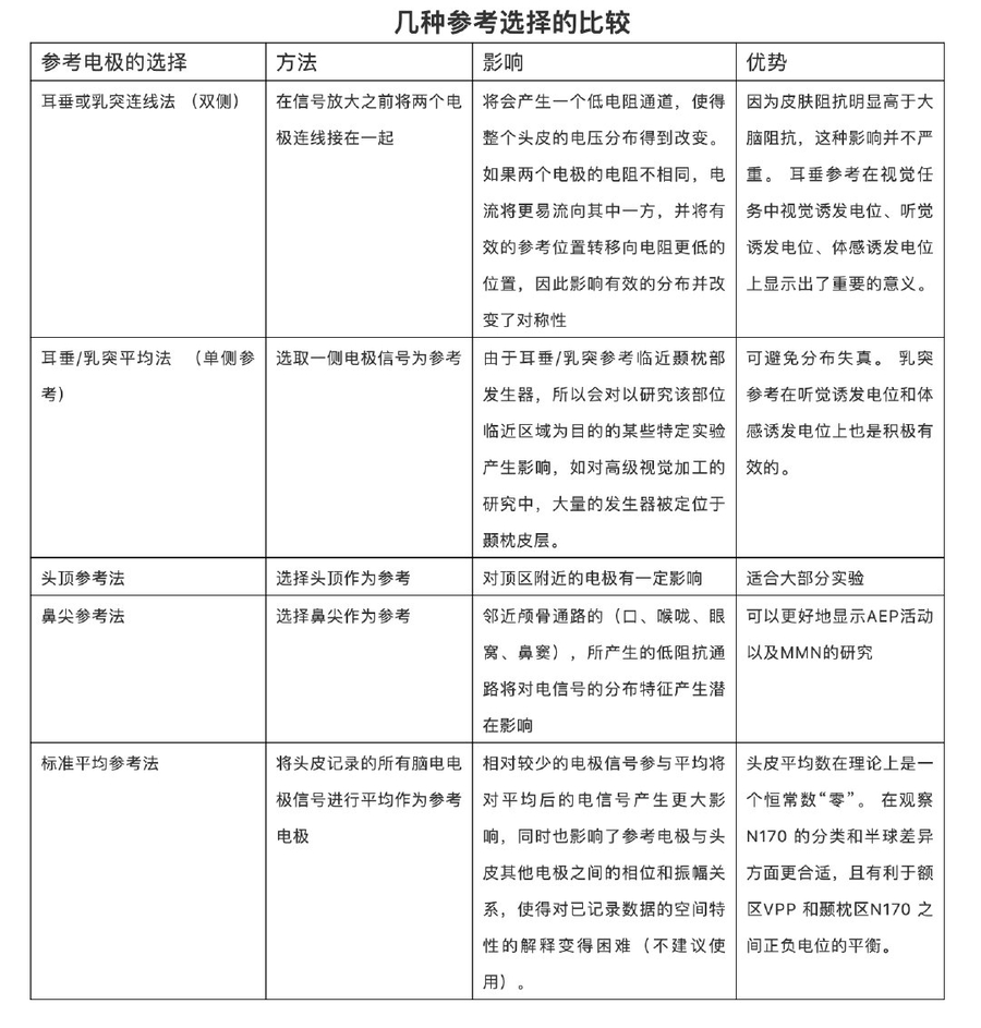 总之,没有对所有实验环境都适用的完美的参考电极位置。因为不同的实验室偏爱不同的参考电极位置,且相关的神经系统发生器的位置也仍旧未知,所以了解如何选择参考电极位置及不同的参考会对数据产生何种影响是非常重要的,其核心在于了解如何根据所选的不同的参考位置来解释数据结果。