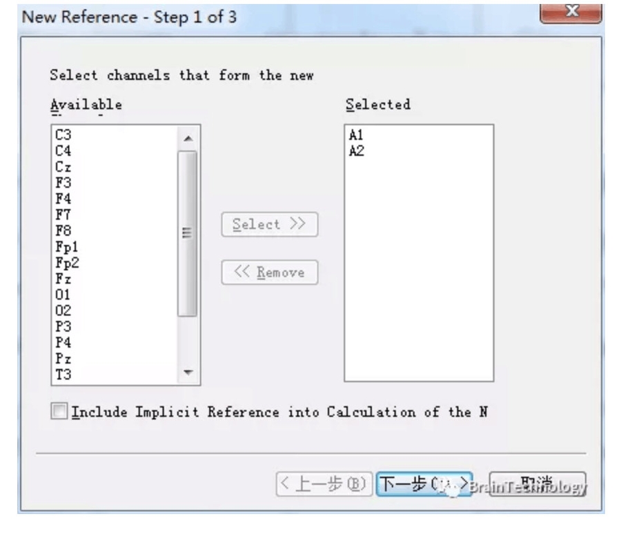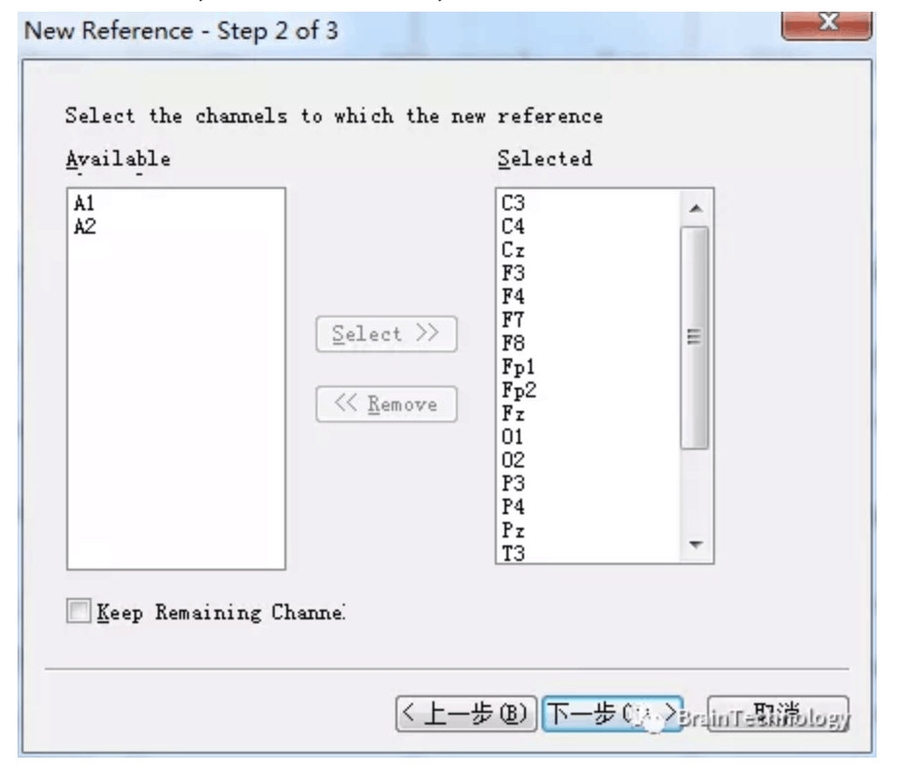选择要做重参考的电极,若选择复选框,将保留没有做参考的电极点。