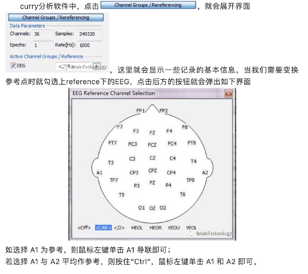现有电极帽都是以头顶或鼻尖做为参考电极,而实际分析ERP波形时,大部分都是根据双侧乳突TP9,TP10(BP的电极帽TP9相当于A1,TP10相当A2)作为参考电极,所以根据实际需要进行更换参考电极。