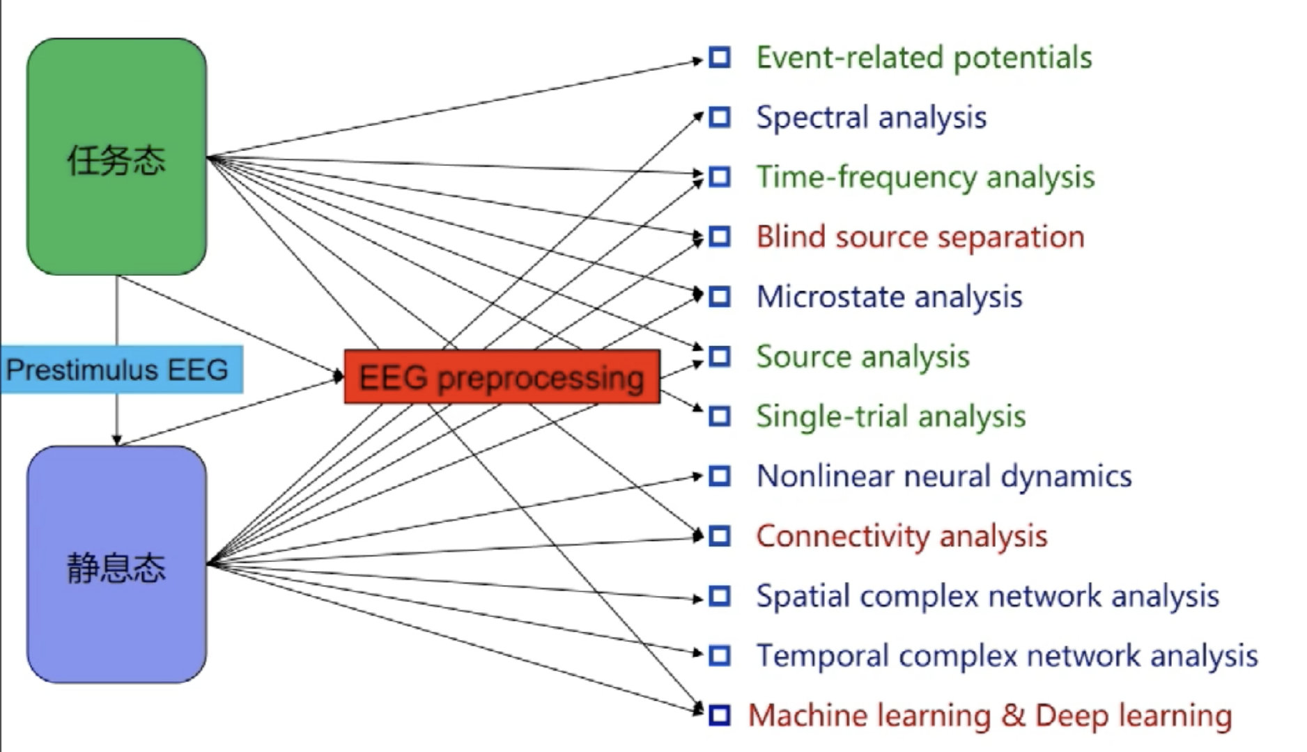 在我的文章中,我不喜欢贴数学公式来讲解一些内容,这部分对我个人来说,觉得是繁琐复杂的。我比较喜欢通过通俗的语言来介绍。在EEG领域,我们通常会进行的一些分析,可以参考以下这张图。