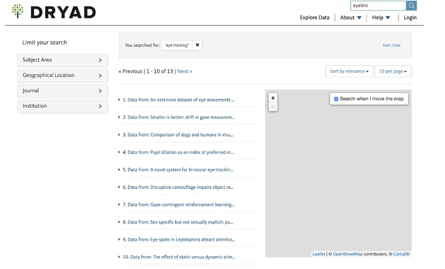 Dryad是一个开源的,社区共建的项目,采用独特的方法进行数据发布和数据保存。Dryad专注于搜索,呈现和发现,并将数据保存功能的责任委托给与其集成的基础存储库。通过关键词“EyeLink”、“EyeTracking”可以搜索到相关内容。