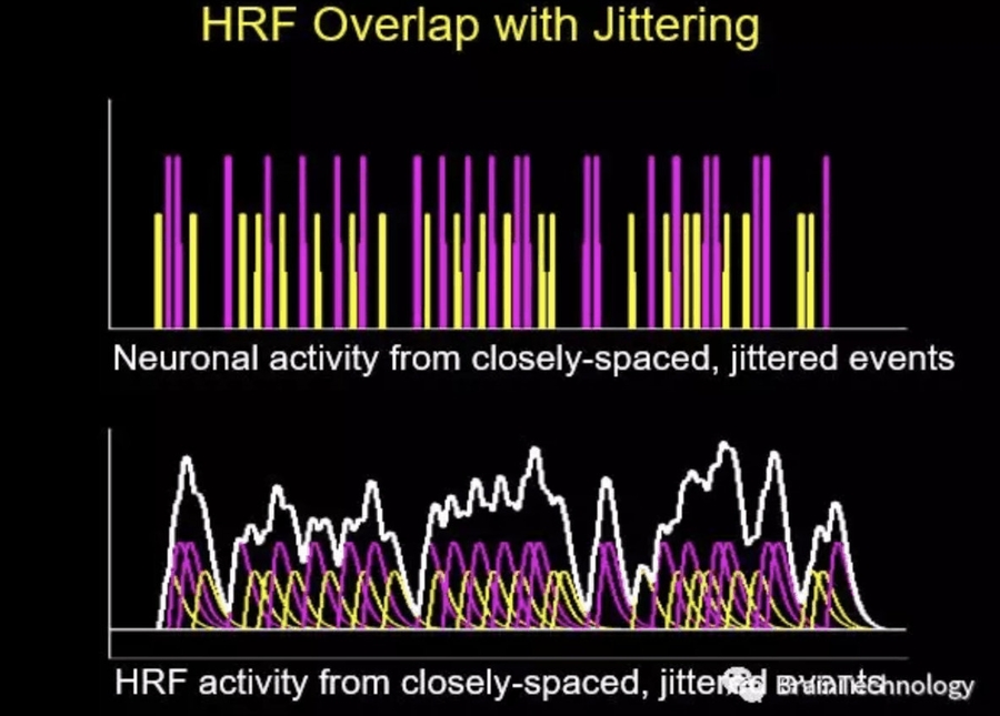 Jitter ER:这种方法的实验设计是能区分不同条件下单trail下的大脑活动变化,有很好的检测率,能提取出每个trial下的β值,但是却HRF估计值是不那么准确的。加上Jitter的好处在于可以使大脑波动更强烈一点,这有点像做脑电实验的trial。