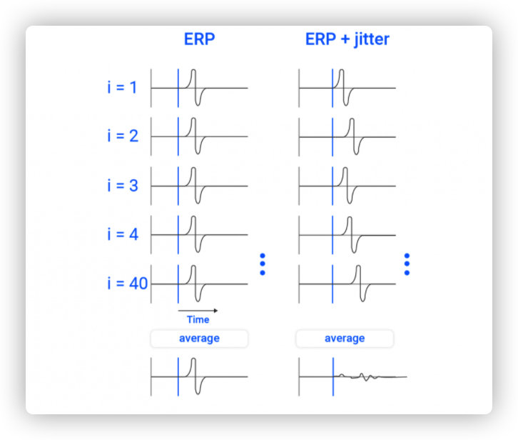 如果触发事件的时间戳未能确保正确同步,得到的结果可能会完全没有用,可以参考文章《 ERP实验中时间延迟的问题》,在这篇文章中,我讲到事件时间戳的问题,它同样适用于同步多模态 的实验。因为,我们在做ERP(事件相关电位)时,非常依赖触发事件的准确性。我们熟悉的ERP成分,如果看到下图中的发生触发的marker产生jitter,那么很不幸的无论如何也得不到很好的结果的。